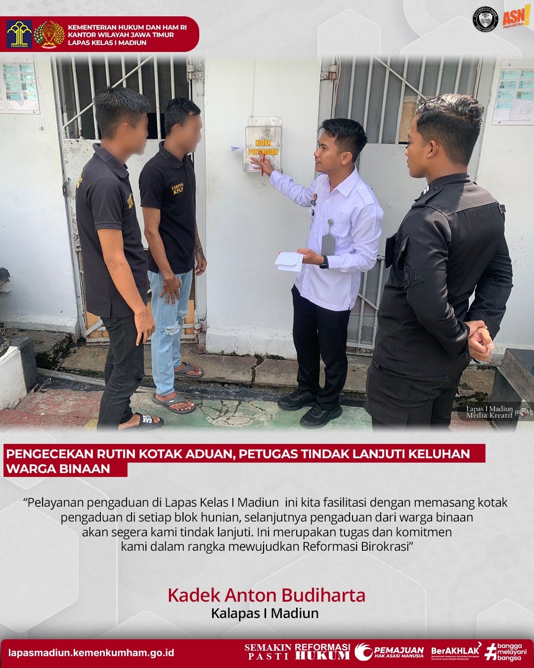 MADIUN, BUSERJATIM. COM GROUP – Dalam rangka meningkatkan kualitas pelayanan di Lembaga Pemasyarakatan, petugas Lapas Kelas I Madiun rutin laksanakan pengecekan kotak pengaduan. Kotak aduan terletak di setiap blok hunian warga binaan, hal ini untuk memudahkan warga binaan dalam menyampaikan keluhan serta aspirasinya.