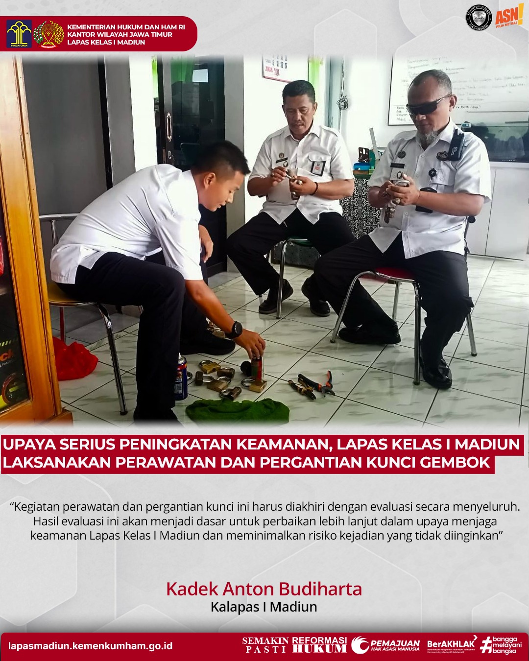 MADIUN, BUSERJATIM.COM GROUP – Lapas Kelas I Madiun melaksanakan kegiatan perawatan dan pergantian kunci gembok yang mengalami kerusakan. Kegiatan ini merupakan upaya serius didalam meningkatkan keamanan di Lembaga Pemasyarakatan kelas I Madiun yang diinisiasi oleh Seksi Keamanan sebagai bagian dari strategi peningkatan keamanan dan pengawasan, Rabu (31/01).