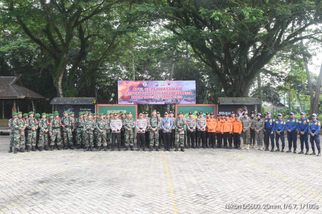 BARABAI, BUSERJATIM.COM GROUP – Kodim 1002/Hulu Sungai Tengah (HST) menggelar Apel Gelar Pasukan Penyiapan Penanggulangan Kebakaran Hutan dan Lahan (Karhutla) Tahun 2025 di Lapangan Apel Makodim 1002/HST, Jl. Telaga Padawangan, Barabai, Kamis (7/8/2025).