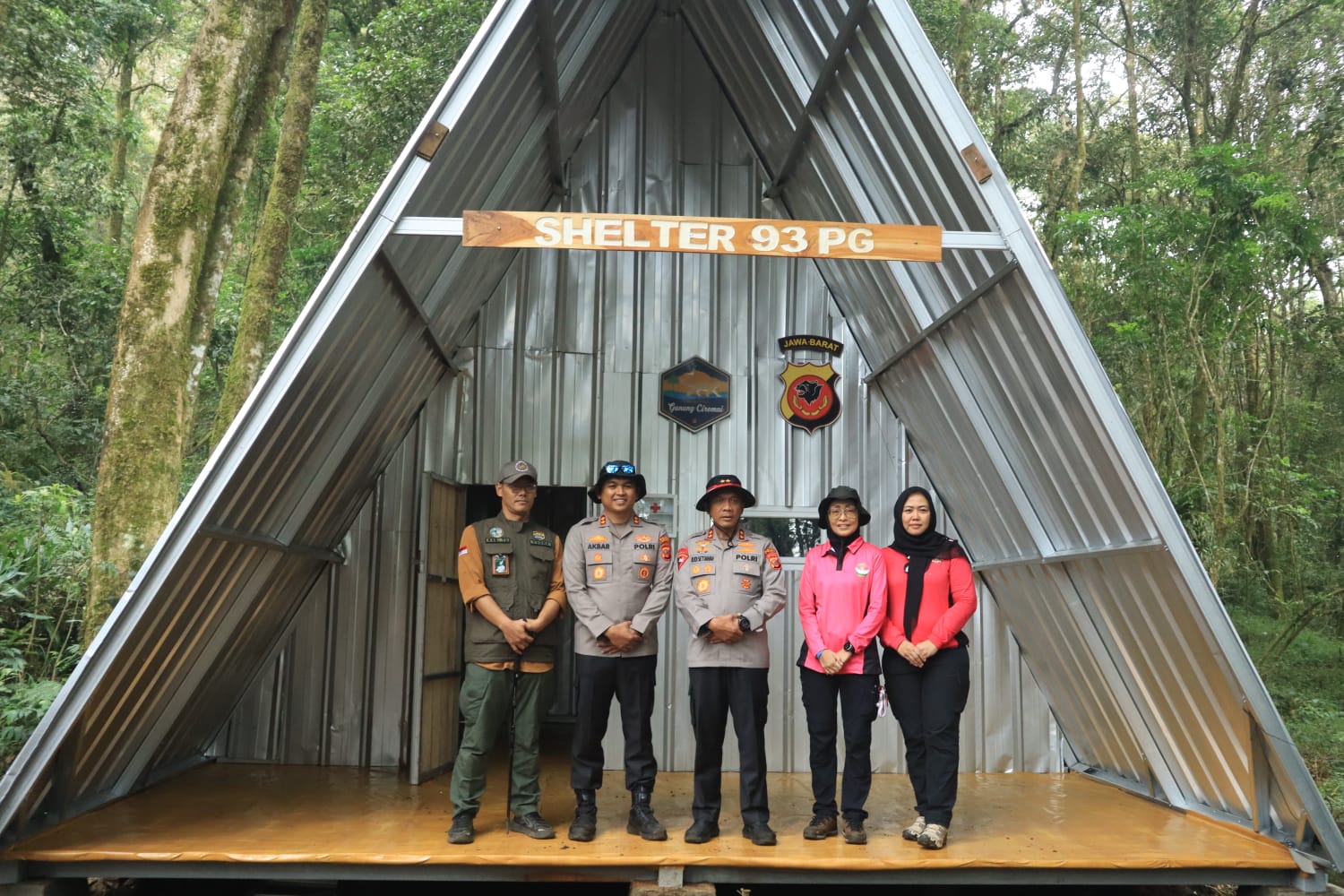 Kapolda Jawa Barat Irjen Pol. Rudi Setiawan, S.I.K., S.H., M.H., didampingi Wakapolda Jabar, Pejabat Utama (PJU) Polda Jabar bersama TNGC, Perhutani, LSM Akar dan PPGC melakukan peresmian Shelter Pesat Gatra 93 (Pos PG 93) yang terletak di Pos 3 Jalur Pendakian Gunung Ciremai, Jumat (8/8/2025).