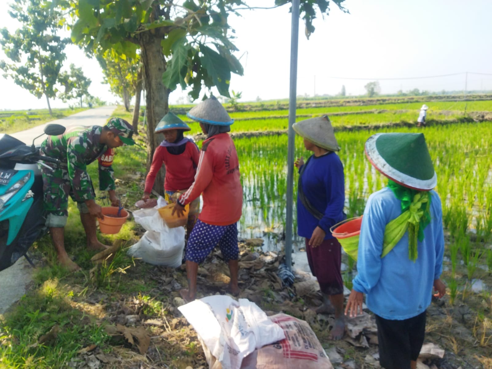 Pada saat ini sudah memasuki periode yang sangat rentan terhadap hama maka para petani harus memberikan perawatan yang intens sehingga padinya akan berkembang seperti yang di harapkan. Sertu Broto berkesempatan membantu para petani di Desa Binaannya, hal tersebut di sambut baik oleh warga yang kebetulan sedang melaksanakan pemupukan di sawahnya.