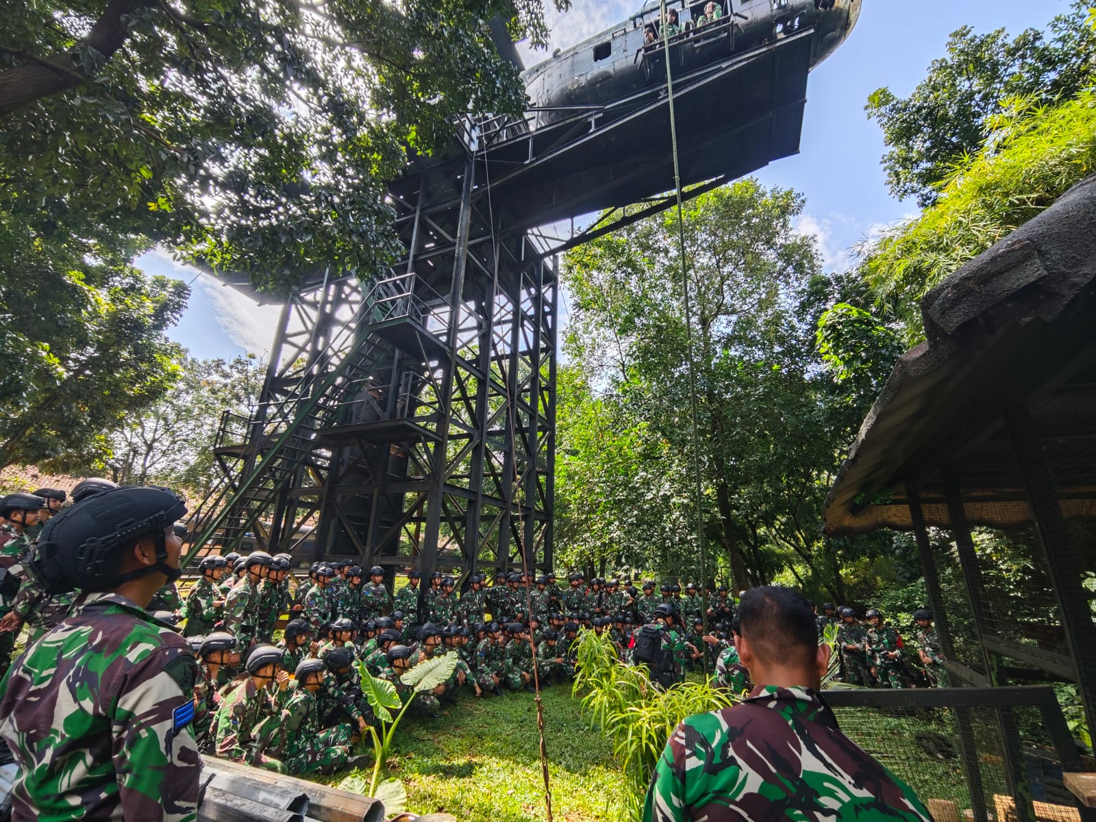 Latihan fast rope merupakan teknik turun cepat dari helikopter menggunakan tali khusus tanpa alat bantu tambahan. Materi ini bertujuan untuk melatih prajurit agar mampu melakukan infiltrasi secara cepat dan tepat di berbagai medan, khususnya pada operasi pendaratan maupun penugasan khusus.