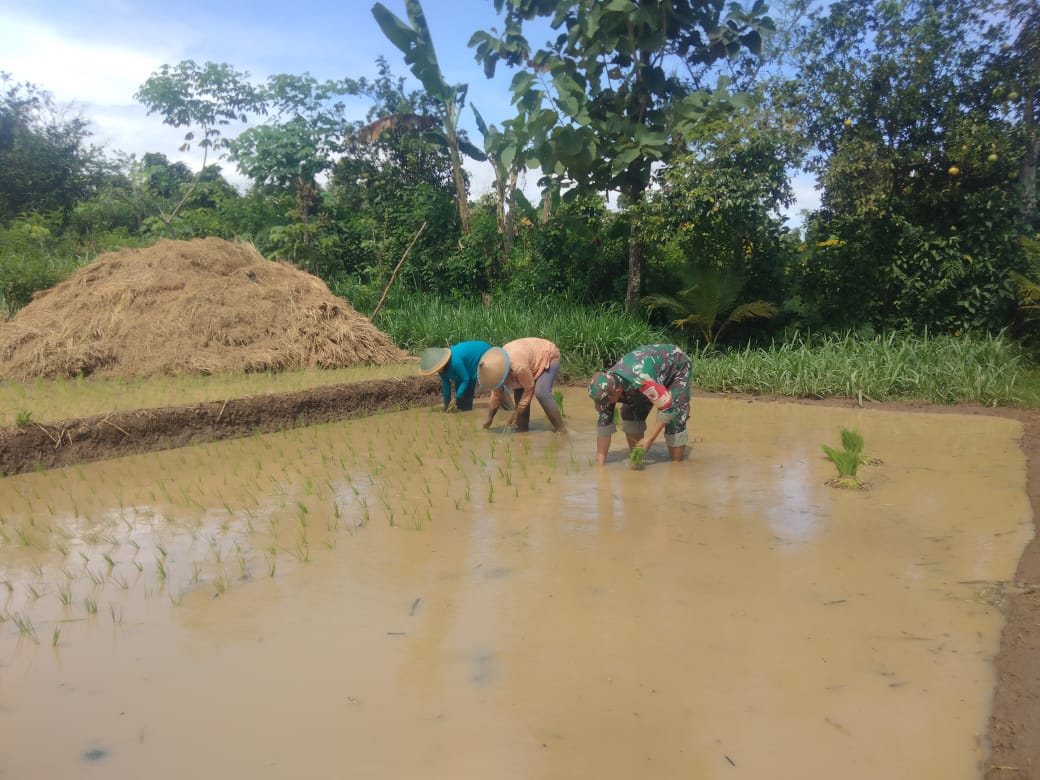 Kegiatan pendampingan tersebut dilakukan sebagai bentuk dukungan TNI AD melalui aparat kewilayahan dalam memperkuat ketahanan pangan di wilayah binaan. Kehadiran Babinsa di tengah para petani tidak hanya memberi motivasi, tetapi juga membantu secara langsung proses penanaman padi di lahan persawahan milik warga.