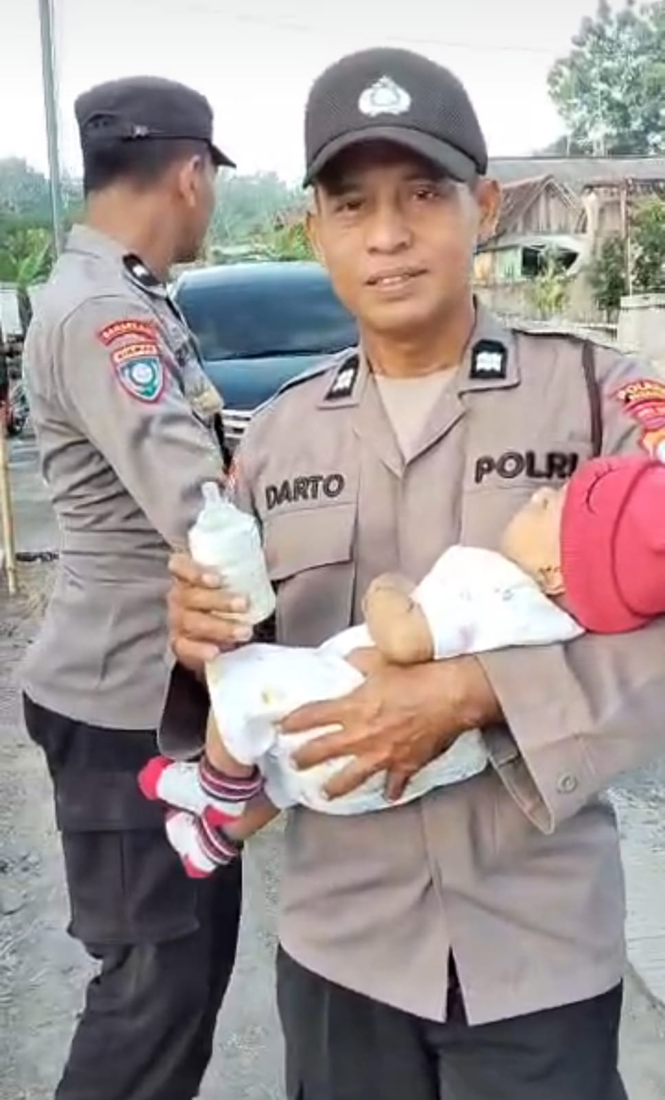 Dalam kegiatan tersebut, Aiptu Darto membantu menggendong seorang balita karena ibunya sedang menunaikan Salat Id.