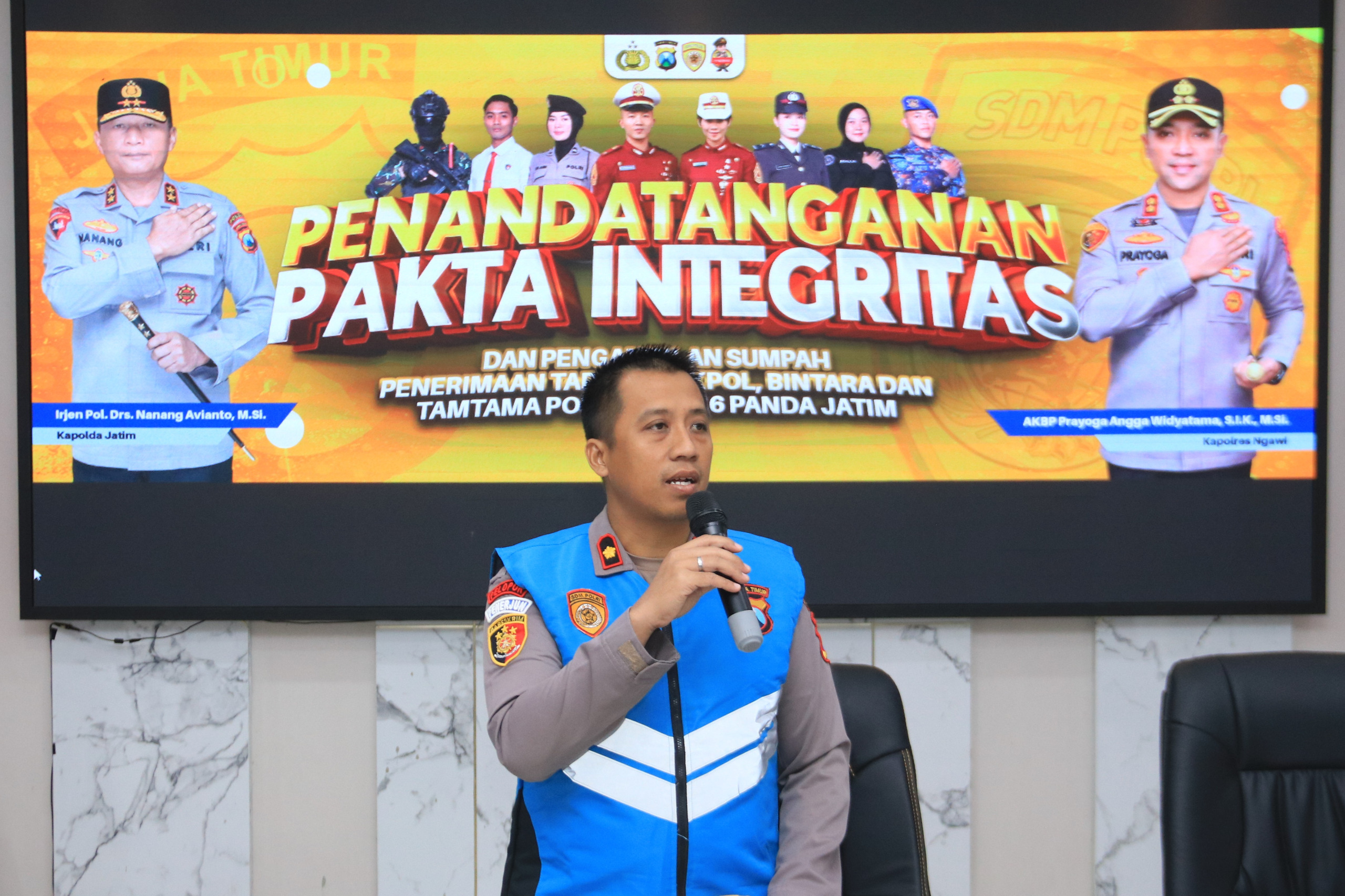 Ngawi – Dalam rangka menjamin proses rekrutmen anggota Kepolisian Negara Republik Indonesia (Polri) yang bersih dan berintegritas, Polres Ngawi menggelar penandatanganan pakta integritas serta pengambilan sumpah penerimaan anggota Polri Tahun Anggaran 2026 secara virtual.