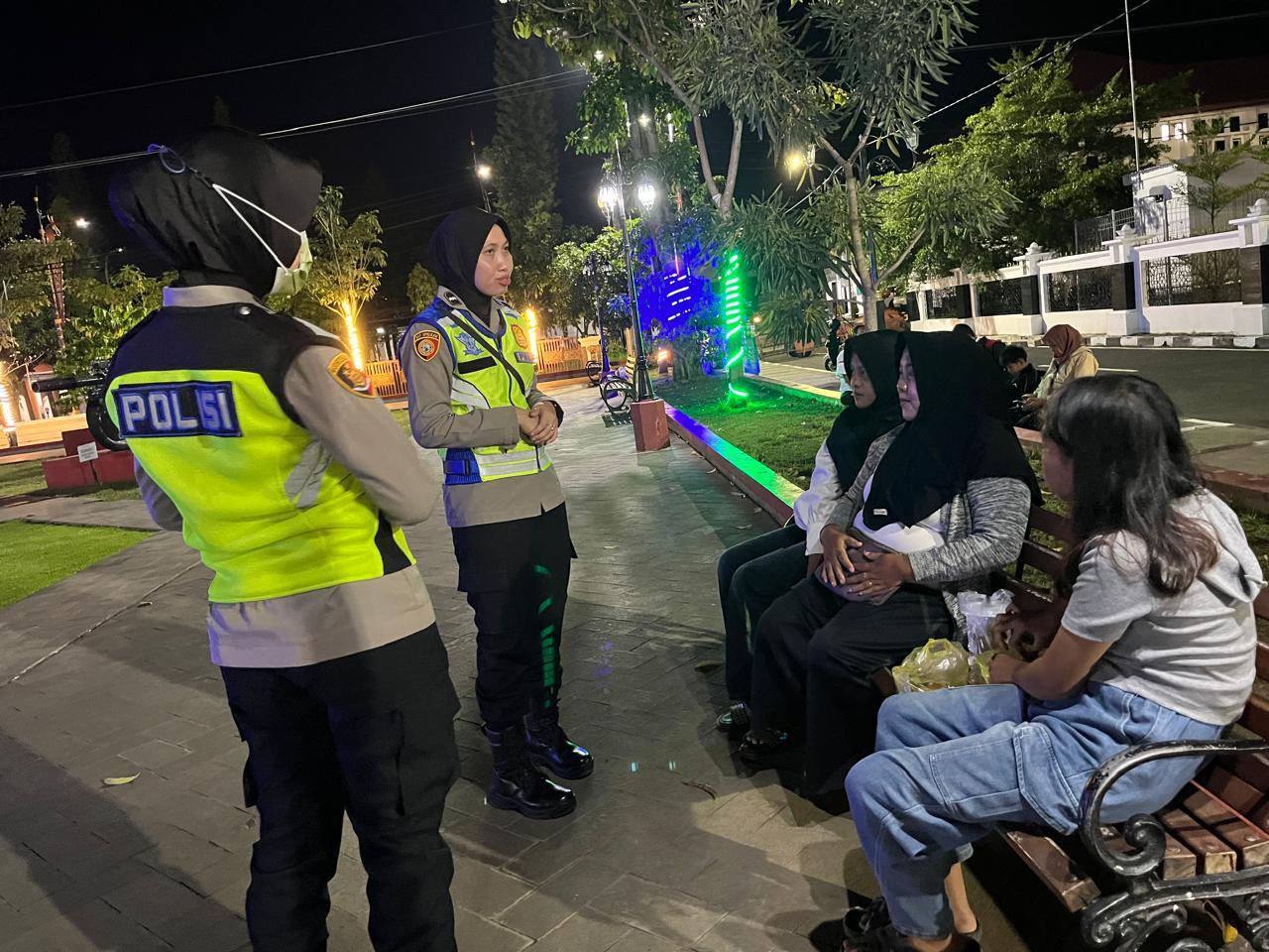 Para srikandi Polri ini melakukan patroli jalan kaki menyisir setiap sudut Alun-alun.