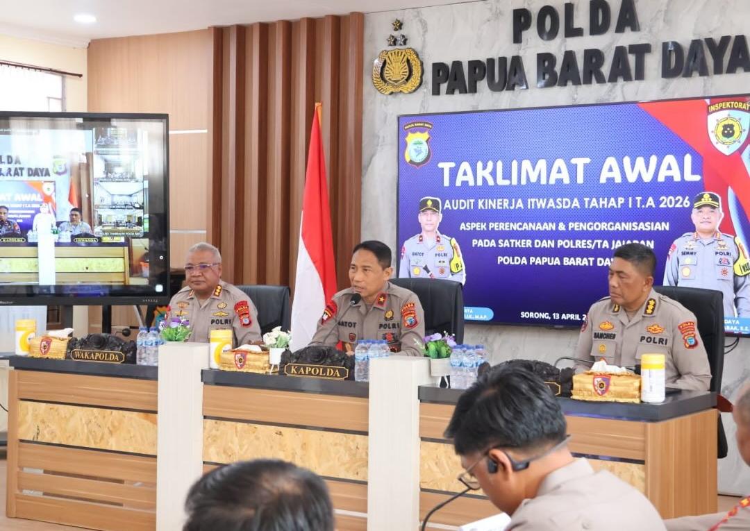 SORONG, BUSERJATIM.COM GROUP – Kepolisian Daerah (Polda) Papua Barat Daya resmi memulai pelaksanaan Audit Kinerja Itwasda Tahap I Tahun Anggaran 2026 yang berfokus pada aspek perencanaan dan pengorganisasian. Pembukaan rangkaian audit ini ditandai dengan kegiatan Taklimat Awal yang berlangsung di Aula Vicon Mapolda Papua Barat Daya, Senin (13/4/2026).